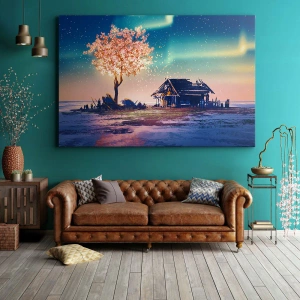 Motiv osamělého domu a kvetoucího stromu na pozadí hvězdné oblohy dokonale doplňuje moderní i klasický interiérový design. Tento obraz vám umožní vytvořit prostor plný inspirace a reflexe a zároveň poslouží jako decentní dekorace na zeď.