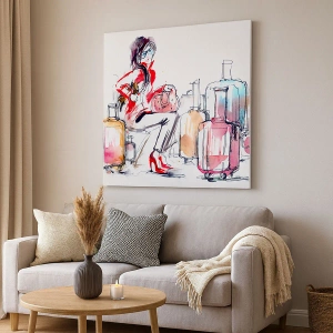 - Obraz zobrazuje ženu sedící obklopenou kufry v dynamickém akvarelovém stylu. Kompozice vyzařuje energii a přípravu na cestování, což z ní činí ideální dekoraci do moderních interiérů.