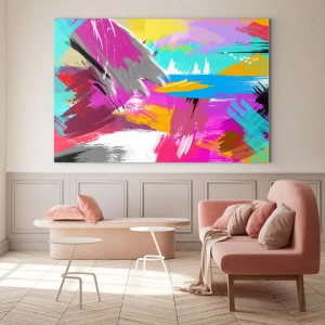Barevná abstrakce se dokonale hodí do moderních prostor, kterým dominují minimalistické formy a výrazné akcenty. Živé barvy a kontrasty oživují místnost a dodávají jí jedinečný charakter. Tento obraz se bude perfektně hodit do obývacího pokoje, kanceláře nebo kreativního prostoru a bude inspirovat k akci.