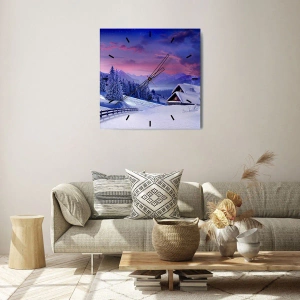 Nástěnné hodiny - Zimní krajina s chatou v horách při západu slunce - 30x30cm - Tichá noc - Moderní nástěnná dekorace do obývacího pokoje, kuchyně a ložnice ARTTOR