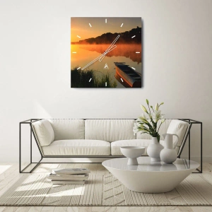 - Tyto nástěnné hodiny zobrazují loď na jezeře za rána, zahalenou v mlze. Teplé odstíny vycházejícího slunce a klidná scenérie vytvářejí harmonický interiérový design.