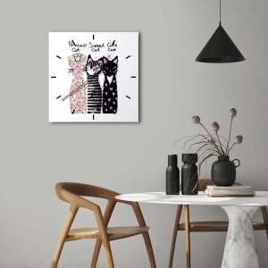 - Tyto nástěnné hodiny zdobí motiv tří koček v různých stylech, zdobené květinami, srdíčky a nápisy. Jsou perfektním doplňkem do každé ložnice, kanceláře nebo dětského pokoje. Jejich kulatý formát měří 30x30 cm.