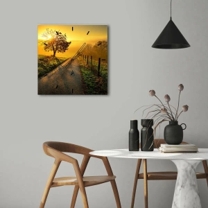 - Tyto nástěnné hodiny zdobí malebný motiv cesty ozářené zlatými paprsky slunce. Jsou ideální pro milovníky přírody a klidné krajiny a vnesou teplo a harmonii do každého interiéru.