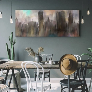 Kompozice z oceli, kamene a mlhy je plátěný obraz, který zobrazuje decentní a uměleckou městskou krajinu s mrakodrapy v pastelových odstínech. Tato jedinečná kompozice vnáší do každého interiéru atmosférický a inspirativní akcent.