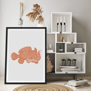 - Plakát obsahuje detailní ilustraci hlubinné ryby v rezavém odstínu, vykreslenou přesnými liniemi na světlém pozadí. Minimalistický styl a důraz na detail mu dodávají elegantní a moderní vzhled.