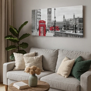 Obraz vyzařuje eleganci a nostalgii a evokuje atmosféru Londýna - města plného historie, kultury a charakteristických symbolů. Kontrast mezi intenzivní červenou barvou budky a tlumeným pozadím zdůrazňuje jedinečnost tohoto motivu a činí z něj ústřední bod každé aranžmá.