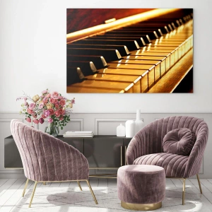 - Obraz zobrazuje detailní záběr kláves klavíru osvětlených teplým světlem, což vytváří elegantní a hudební akcent pro klasicky inspirované interiéry.
