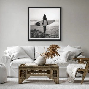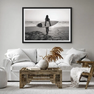- Tento plakát zobrazuje ženu se surfovacím prknem na pláži při západu slunce. Černobílý design se perfektně hodí do elegantních a moderních interiérů. Sada obsahuje černý rám o rozměrech 50x70 cm.