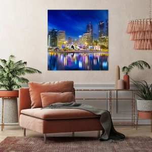• Obraz zobrazuje noční městskou krajinu s výraznými odrazy světel na vodě. Mrakodrapy a hra barev dodávají tomuto dílu dynamický a elegantní nádech.