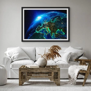 Plakát v černém rámu - Pohled na Evropu z vesmíru, osvětlenou nočními světly. - 50x70cm - Jiskřivá Evropa - Moderní nástěnná dekorace do obývacího pokoje a ložnice ARTTOR