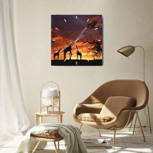 - Siluety žiraf na pozadí velkolepého afrického západu slunce. Unikátní nástěnné hodiny, které vnesou harmonii a exotiku do každého interiéru.