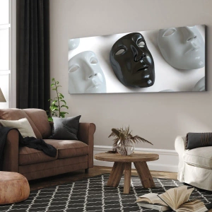 - Obraz zobrazující černobílé masky na světlém pozadí. Minimalistický a moderní motiv, který dodá každému interiéru tajemno a eleganci.