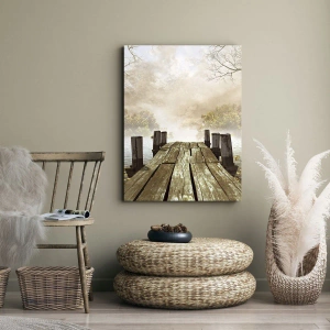Obraz „Dřevěné molo na jezeře“ je decentní nástěnná dekorace, která zachycuje krásu přírody v její nejklidnější podobě. Zobrazuje dřevěné molo vedoucí k jezeru zahalenému v ranní mlze a vytváří atmosféru klidu a harmonie. Jemné podzimní barvy a jemné detaily, jako je padající listí, dodávají obrazu jedinečné kouzlo.