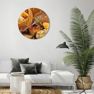 „Znovu jsme upečeni“ jsou elegantní nástěnné hodiny, které přitahují pozornost svou teplou a domáckou atmosférou. Kulatý skleněný ciferník o rozměrech 30x30 cm představuje lákavou kompozici chleba a klasů obilí uspořádaných v rustikálním košíku. Obraz plný teplých barev a detailních detailů odráží tradici a přírodní krásu, dokonale se hodí do klasických interiérů.