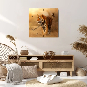 Nástěnné hodiny - Tygr na pozadí zlaté louky - 30x30cm - Před útokem - Moderní nástěnná dekorace do obývacího pokoje, kuchyně a ložnice ARTTOR