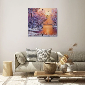 - Obraz zobrazuje zimní krajinu s mostem, stromy a sněhem. Hodiny jsou skleněné o rozměrech 30x30 cm se zimní tematikou.