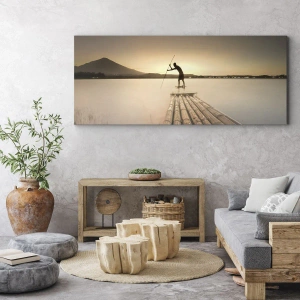 - Tento obraz zobrazuje muže na bambusovém voru při západu slunce. Pokojný a harmonický motiv, ideální pro dodání tepla a přírodního kouzla jakémukoli interiéru.