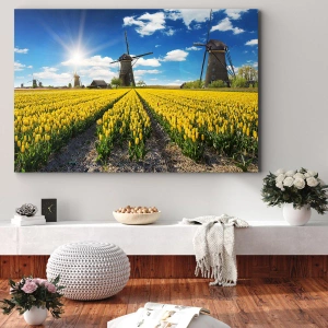 - Tento obraz zobrazuje pole žlutých tulipánů s větrnými mlýny na obzoru. Je ideální pro milovníky přírody a evropské krajiny a vnáší harmonii do každého interiéru.