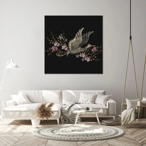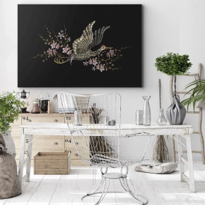 - Obraz zobrazuje exotického ptáka za letu, obklopeného jemnými květinami na černém pozadí. Syté barvy a detaily v orientálním stylu dodávají obrazu eleganci a jedinečný charakter.