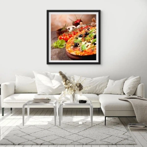 - Tento plakát zobrazuje lahodnou pizzu s olivami, bylinkami a sýrem, obklopenou čerstvými surovinami na rustikálním pozadí. Dodává se s černým rámem o rozměrech 50x70 cm a je perfektní dekorací do vaší kuchyně nebo jídelny.