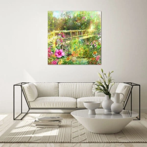 - Tento skleněný obraz zobrazuje most obklopený bujnou vegetací a barevnými květinami. Ideální pro interiéry, které touží po harmonii a klidu.