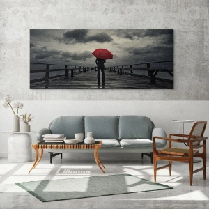 Vizuální kompozici obrazu tvoří prostorný, téměř prázdný prostor mola, který posiluje pocit samoty. Červený deštník v mužových rukou dodává tomuto monochromatickému prostředí barvu, díky čemuž je obraz výraznější a plný kontrastů. Tento obraz se perfektně hodí do minimalistických a moderních interiérů, ale hodí se i do klasičtějších prostor.