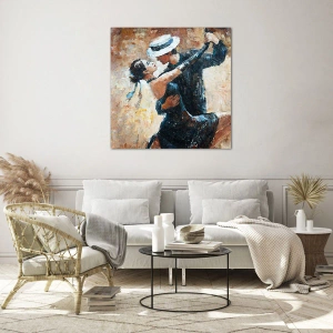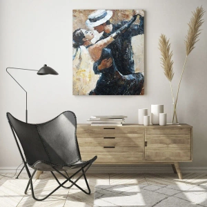 Kompozice se zaměřuje na pár tančící v expresivních pózách, které vyjadřují emoce a vášeň. Stylizované oblečení a jemné detaily, jako je mužský klobouk, dodávají celé scéně klasický charakter. Jemné pozadí zdůrazňuje dynamiku pohybu a dodává obrazu hloubku a výraz.