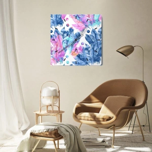 Nástěnné hodiny - Barevné peří ve stylu akvarelu - 30x30cm - Chocholy v růžové a blankytné - Moderní nástěnná dekorace do obývacího pokoje, kuchyně a ložnice ARTTOR