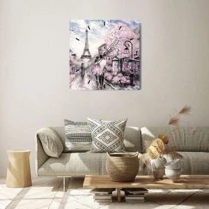 Nástěnné hodiny - Romantický výhled na Paříž s Eiffelovou věží a kvetoucími stromy - 30x30cm - Když se zamilovat, tak jenom v… - Moderní nástěnná dekorace do obývacího pokoje, kuchyně a ložnice ARTTOR