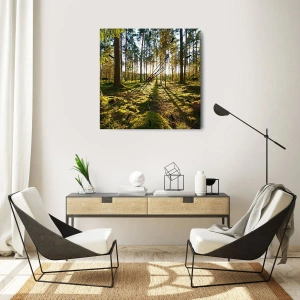 Nástěnné hodiny - Sluneční světlo prosvítající vysokými stromy v lese - 30x30cm - …Za sedmero lesy - Moderní nástěnná dekorace do obývacího pokoje, kuchyně a ložnice ARTTOR
