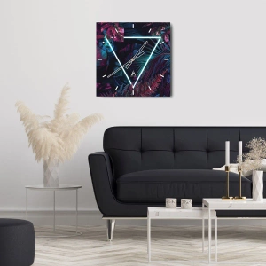 "Disco Garden" je návrh pro ty, kteří si cení originality a intenzivního vizuálního vyjádření. Hlavními prvky kompozice jsou tropické listy a vegetace v odstínech fialové, růžové a tyrkysové, umístěné na tmavém pozadí. Ústředním akcentem je neonový trojúhelník, který osvětluje celé dílo a dodává scéně disco styl a energický charakter.
