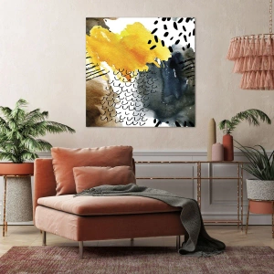 - Moderní abstraktní kompozice se žlutými akcenty a grafickými vzory. Tato dekorace vnáší energii a styl do moderních interiérů.