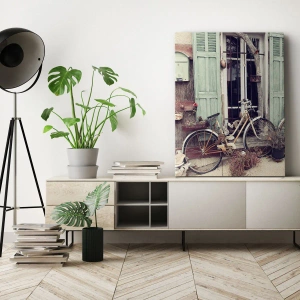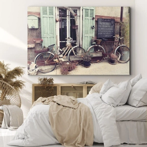 - Obraz zobrazuje dvě vintage kola umístěná před dřevěnými dveřmi s pastelovými okenicemi. Rustikální detaily, jako jsou květiny a pečlivě vybrané dekorace, dotvářejí celkový vzhled a dodávají mu hřejivý provensálský nádech.