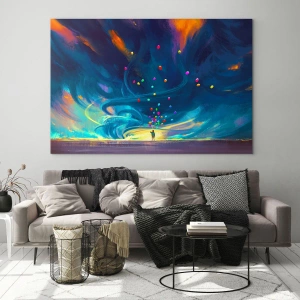 Nástěnný obraz Na modrém větru - Osoba držící barevné balónky na pozadí modrého větru