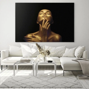 - Portrét ženy ve zlatých odstínech, zobrazující smyslnost a eleganci. Obraz se dokonale hodí do moderních prostor a dodává mu jedinečný charakter.
