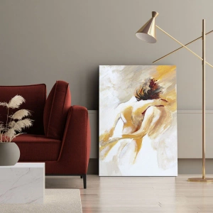 Plátno "Abstraktní scéna romantického objetí" je unikátní dekorace, která kombinuje jemnost s jasností uměleckého vyjádření. Scéna zobrazuje jemnou kompozici dvou postav v romantickém objetí, vyzdobenou v teplých odstínech žluté, béžové a bílé, což celému obrazu dodává eleganci a harmonii. Minimalistická forma a jemné linie zdůrazňují intimní povahu obrazu.