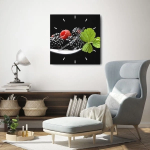 Nástěnné hodiny - Maliny a ostružiny na pozadí zelených listů - 30x30cm - Chuť svěžesti - Moderní nástěnná dekorace do obývacího pokoje, kuchyně a ložnice ARTTOR