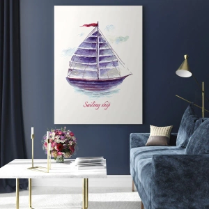- Jemný akvarel zobrazující plachetnici s červeným stěžněm a nápisem „Plachetnice“. Jemné odstíny modré a fialové vyjadřují klidnou atmosféru plavby po moři. Ideální do interiérů s námořnickou tematikou.