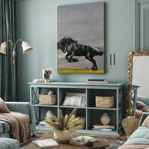 - Tento obraz zobrazuje černého koně v dynamickém skoku proti obloze. Symbol síly, svobody a elegance, ideální pro klasické i moderní interiéry.