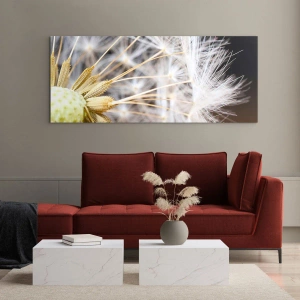 Detail pampelišky s křehkými semínky vznášejícími se ve vzduchu vytváří minimalistickou kompozici, která do interiéru vnáší klid a harmonii. Skleněný obraz o rozměrech 70x50 cm se vyznačuje elegancí a odolností.