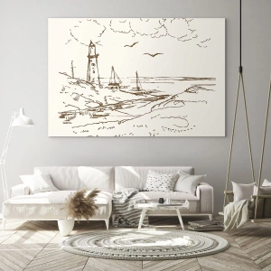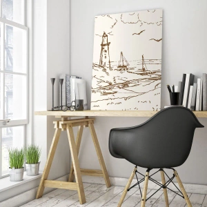 - Umělecká skica zobrazující maják na pobřeží s plovoucími ptáky a plachetnicemi na vodě. Jemné linie a minimalistický tvar dodávají kompozici elegantní a klidný nádech. Dokonalá dekorace pro námořnické a klasické interiéry.