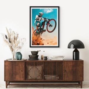 Plakát v černém rámu - Horský cyklista provádí dynamický skok na pozadí pouštní krajiny. - 50x70cm - Cyklistický démon šílenství - Moderní nástěnná dekorace do obývacího pokoje a ložnice ARTTOR