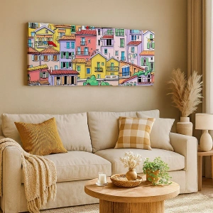 - Obraz zobrazuje barevné řadové domy ve veselém stylu. Živá a expresivní dekorace, která vnese energii a styl do každého interiéru.