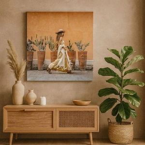 „Hippie styl“ je mimořádný obraz na plátně, který do interiéru vnáší atmosféru přirozenosti a klidu. Zobrazuje boho ženu kráčející vedle řady kaktusových květináčů na pozadí teplých odstínů béžové a pískové zdi.