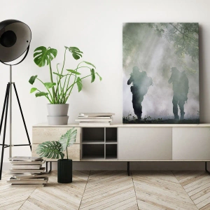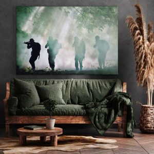 - Siluety vojáků v lese zahaleném v mlze vytvářejí tajemnou a expresivní krajinu. Dokonalá dekorace pro vnesení charakteru a inspirace.