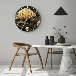 Nástěnné hodiny – Jemná křehkost – Zlatý a černý květ na tmavém pozadí