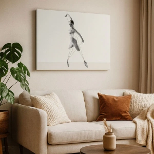 „V divadle světa“ je unikátní obraz na plátně o rozměrech 70x50 cm v horizontálním formátu, zobrazující baletku v dynamické póze, obklopenou geometrickými liniemi, které dodávají celému obrazu moderní a minimalistický charakter. Černobílé barvy obrazu v kombinaci s jemným pozadím zdůrazňují eleganci a lehkost pohybu baletky.