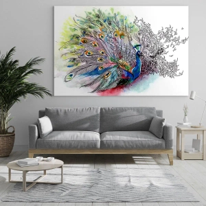 - Obraz zobrazuje páva v rozmarné, umělecké podobě, částečně provedené akvarelem a částečně načrtnuté. Intenzivní barvy a bohaté detaily mu dodávají jedinečný charakter.