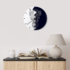 Nástěnné hodiny „Souboj a jednota protikladů“ jsou unikátní dekorativní prvek, který potěší svým geometrickým designem a minimalistickým charakterem. Ciferník hodin zdobí geometrický motiv jelena, umístěný na kontrastním bílém a černém pozadí. Tento unikátní design dodává interiéru eleganci a umělecký výraz.