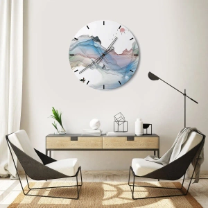 - Nástěnné hodiny s uměleckým motivem hor v pastelových barvách a loďky plující na vodní hladině. Kompozice přináší harmonii, klid a inspiruje k míru. Ideální do moderního interiéru.